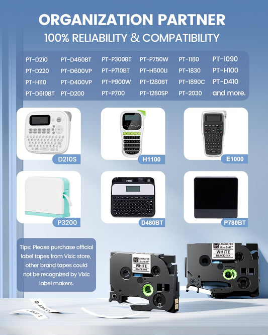 12mm 0.47 Laminated White BZ Tape Compatible with Brother P Touch Label Tape TZ Tape, Vixic D210S H1100 E1000 P3200 D480BT P780BT Labeler P Touch PT-D210 PT-H110 PT-D400 PT-D600 PT-P700 Label Maker